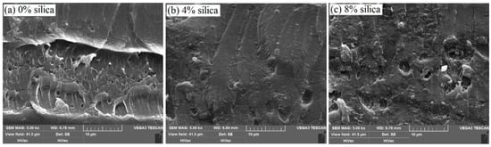 SEM images of the wear surface of PVA/PAM/nanosilica with different nanosilica contents at magnifications of 5000×: (a) pure PVA/PAM composite; (b) PVA/PAM/4% silica composite; and (c) PVA/PAM/8% silica composite.