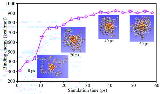 where Etotal is the energy of the polymer/silica composite, Epolymer is the energy of the polymer, and Esilica is the energy of the nanosilica particle. Figure 8 shows the binding energies between the nanosilica particle and the polymer chains at different MD simulation times.