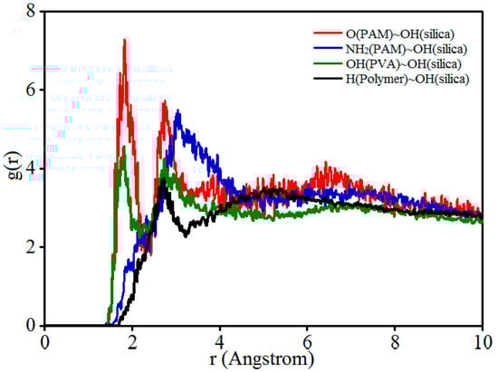 To further determine the interaction mechanism, the pair correlation functions (PCF) between polymer chains and nanosilica were studied by analyzing the final configuration (60 ps) of the amorphous cell. Here, the polymer chains that surrounded the nanosilica particle were used to analyze; Figure 9 shows the PCF g(r) values of the functional groups and polar atoms that exert stronger interaction forces in the models.