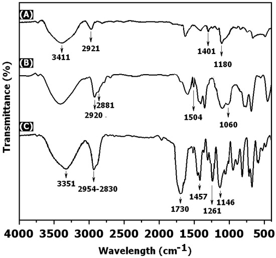 The surface grafting of RAFT is expected to promote the anchoring of PPEGMA chains onto the CdTe surface. As can be seen in Figure 1C, the results of FT-IR analysis displayed peaks of 3351 (–O–H), 2830–2954 (aromatic C–H), 1730 (C=O groups), 1457 (aliphatic C–H groups), 1263 (bending and rocking C–H groups), and 1146 cm−1 (ether species). This showed that PPEGMA was covalently attached to the exterior of the CdTe QDs.