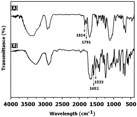 The combination of O–H groups to the edge chains of a PEG-based polymer has become a new application for biomolecule conjugates (eg., antibacterial peptides and enzymes). In this study, we used DSC to activate the hydroxyl groups of the PPEGMA brushes to create DSC-f-PPEGMA-g-CdTe QD surface. The FT-IR spectrum analysis (Figure 4A) showed peaks at 1814 and 1791 cm−1, which describe the C=O stretching vibration of the NHS group, confirming that the hydroxyl groups had been activated. After activation, we observed the combination of the activated PPEGMA-recovered CdTe with bioactive molecules. The activated PPEGMA shells formed the amide bond with a main amino group of the adenosine substance. A change in FT-IR spectrum was observed after the functionalization process of DSC-f-PPEGMA-g-CdTe QDs with adenosine compounds. As shown in Figure 4, the peaks at 1652 and 1533 cm−1 could be attributed to the amide in adenosine compounds, while the two peaks at around 1814 and 1791 cm−1 showed that the NHS species were absent, confirming the bonds in adenosine. This verified that adenosine compounds were grafted on the outer of CdTe via covalent modification.