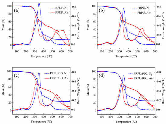As far as the residue yield was concerned, the residue yield of the pure RPUF was less than 0.5% at 700 °C, and the residue yields of other specimens (FRPU, FRPU/GO, and FRPU/fGO) were 7.0%, 9.5%, and 12.5% in air, respectively. It is clear that the residue yields of RPUF specimens were in the following ascending order: RPUF < FRPU < FRPU/GO < FRPU/fGO. A similar rule for the residue yield was observed in a nitrogen atmosphere.