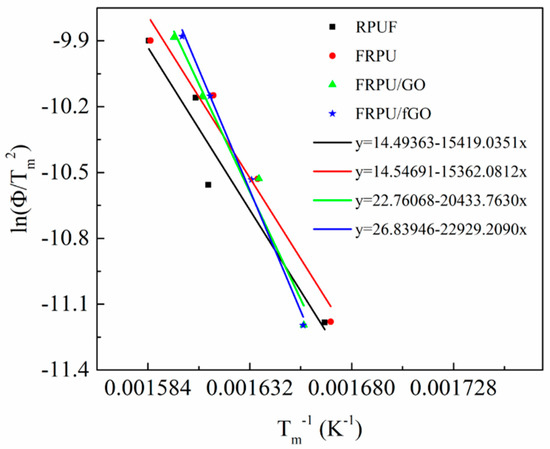 From the slope of the plot of ln(Φ/Tm2) versus 1/Tm, Ea can be calculated (E = R × slope). The calculation process is shown in Figure 3. Table 3 presents the activation energies (Ea) of various RPUF specimens. As observed from the results presented in Table 3, the Ea for the decomposition of RPUF is 130 kJ·mol−1, while that of EG/DMMP/RPUF (FRPU) is 128 kJ mol−1, which shows a drop of around 2.0 kJ·mol−1 and may be due to the catalytic effect of EG/DMMP on the decomposition and carbonization of RPUF. Additionally, the Ea values of FRPU/GO and FRPU/fGO are much higher than those of FRPU, and have the values of 167 kJ·mol−1 and 191 kJ·mol−1, respectively. Generally, the higher the activation energy, the more difficult the degradation of the material. The thermal stability of fGO is better than that of GO, which shows that fGO has better efficiency to increase the thermal stability of RPUF.