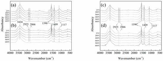 As can be seen from Figure 4, the FT-IR spectra of all samples show a similar absorption peak at 25 °C. The 2925 cm−1 and 2866 cm−1 absorption peaks correspond to stretching mode of C–H in CH2 and CH3, respectively [30]. The peaks around 1590 cm−1 are assigned to the vibration of the aromatic ring [31]. The peaks around 1409 cm−1 are typical for the deformation vibration of CH2. Additionally, the peak near 1117 cm−1 belongs to the C–O–C stretching vibration [32]. With the increase in temperature, the changes in FT-IR spectra for the four samples are found to be similar. However, when the temperature increases to 500 °C, there are nearly no absorption peaks near 2925 cm−1 and 2866 cm−1 in the FT-IR spectra of pure RPUF and FRPU. Furthermore, the weakened intensities of the bands at 1590 cm−1 and 1409 cm−1 are caused by the gradual degradation of the molecular chain. As for FRPU/GO and FRPU/fGO, these peaks still exist and are hardly weakened. Furthermore, the stretching vibration of C–H in methyl and methylene of FRPU/fGO specimen is well preserved at 600 °C, which indicates that the addition of fGO increases the thermal stability of FRPU at high temperature. This result is consistent with the conclusions obtained from the thermogravimetric analysis. Therefore, the higher heat resistance of FRPU/fGO specimen indicates that there is a synergistic effect between fGO and EG/DMMP.