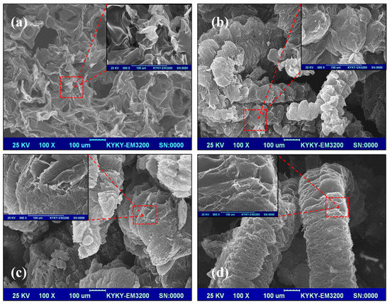 Scanning electron microscopy (SEM) images of the residues of RPUF samples: (a) RPUF; (b) FRPU; (c) FRPU/GO; and (d) FRPU/fGO.