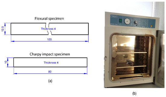 (a) Standard flexural and Charpy impact specimens according to ASTM D7264 and D6110 or ISO 179 recommendations. (b) Programmable oven used for the thermal ageing treatments.