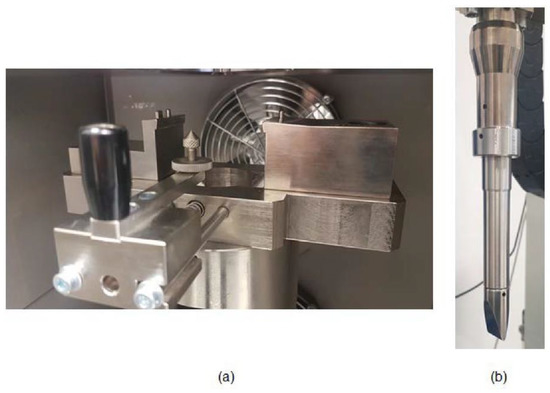 Details of the Charpy testing accessories according to ASTM D6110 used in the drop-weight column. (a) Charpy device support and (b) Charpy impactor (20 mm × 4 mm).