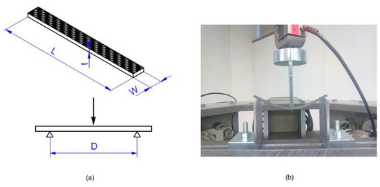 Three-point bending tests were performed using a 50 kN universal electro-mechanical testing machine with a 5 kN load cell at a fixed loading rate of 2 mm/min (Figure 4), according to the ASTM D7264. The radius of the loading nose and the radii of the support noses of the 3-point bending specimen test fixture were 3 mm. The 3-point bending specimen preparation and testing is relatively simple but the results are sensitive to the geometry of the sample. Both the normal stress and shear stress in bending depend strongly on the D/t ratio, where D = 130 mm is the span and t = 4 mm is the thickness. Either bending or shear failure modes can appear depending on the D/t ratio. The standard ASTM D7264 recommends a D/t ratio greater than 32 in order to guarantee flexural failure. This limit has been considered in the dimensions of the flexural specimens. The flexural stress σ, flexural strain ε and flexural modulus E, were calculated using the following expressions, according to the standard ASTM D7264. This standard is based on the Classical Beam Theory (CBT), supposing that shear effects are negligible,