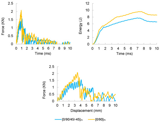 Average force and energy histories and force-displacement curves of non-thermal aged [0/90/±45]2s laminates (Eimpact = 32.46 J).