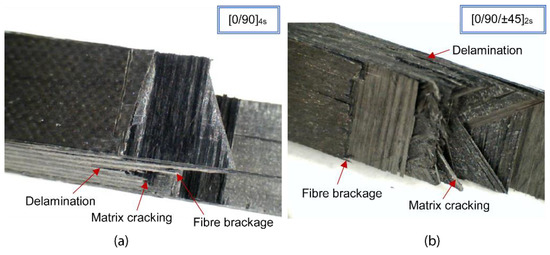Failure modes observed in non-aged (a) [0/90]4s and (b) [0/90/±45]2s laminates (Eimpact = 32.46 J).