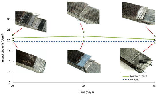 The results obtained from the impact tests of aged laminates at 150 °C for long periods of time are shown in Figure 7. This temperature was below the glass transition temperature (195 °C) and the carbon-epoxy composite laminate was supposed to maintain the mechanical properties, as the manufacturer indicates. For that purpose, ageing treatments at 150 °C for 28, 35 and 42 days followed by impact tests were performed on quasi-isotropic laminates. The average maximum force and impact strength for the different time of ageing were summarized in Table 5. The failure modes observed were a combination of fibre breakage and delamination (Figure 7). The average values of impact strength were plotted in order to observe a possible trend in the impact performance. No degradation was noticed in the impact performance of quasi-isotropic specimens regardless the time of exposure at 150 °C, as can be deduced from the close values of absorbed energy for the different periods of ageing. On the contrary, a slight improvement in the impact strength with respect to the non-aged specimens (19.62 J/cm2) occurred, particularly for the specimens aged at 150 °C for 35 days (22.06 J/cm2) in which the increase in impact strength was about 12.5%. The same behaviour was observed in previous studies, where they observed that before the degradation of the mechanical properties of carbon fibre-reinforced composites, a consolidation phase occurred related to a post-curing process [20,47]. The exposure to temperatures below the glass transition temperature ensured better adhesion between the matrix and the fibres and improved the impact response of this material.