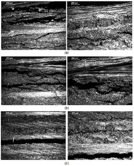 Cross sectional optical micrographs of the failure areas of flexural quasi-isotropic [0/90/±45]2s samples. (a) Non-Aged; (b) aged at 190 °C for 10 days, (c) aged at 250 °C for 10 days.