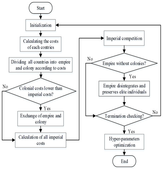 Hyper-parameters play important roles in the W-LSSVR model, thus, the selection of the hyper-parameters will affect the performance of the W-LSSVR. The main objective is to find a better way to select the optimal choices from several candidate parameters by applying cross validation. Based on this idea, it is necessary to use more rigorous approaches such as analytical techniques and heuristic algorithms to get the best hyper-parameters. While gradient-based algorithms determine the hyper-parameters of analytical techniques, modern evolutionary algorithms like simulated annealing algorithms, the genetic algorithm and imperialist competition algorithm determine the hyper-parameters of heuristic algorithms [37,38,39]. In this paper, the W-LSSVR model is optimized by using the ICA [40].