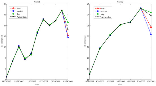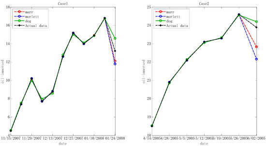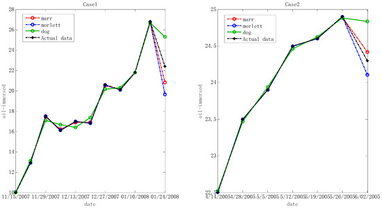 In the study, the aforementioned three kinds of wavelet kernels including Morlet, Marr and DOG are investigated. For Case 1, the periodical sampling time was the period between November 2009 and January 2010. First, the experimental data, including training data and testing data were normalized before applying W-LSSVR. Then, taking the Morlet W-LSSVR as an example, the algorithm of ICA with mutation is implanted to find the optimal hyper-parameters for each group of the key gas contents by using 5-fold cross validation. The parameters of the ICA algorithm used in this paper are as follows: the number of countries and the number of initial imperialists were fixed to 20 and 6, respectively; the dimension of the optimized function was set to 2; the maximum number of generations was 100; the revolution rate was set to 0.3; the assimilation coefficient equaled 2, and the assimilation angle coefficient equaled 0.5.