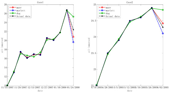 Forecasting results with three kinds of W-LSSVRs for CH4 in Case 1 and Case 2.