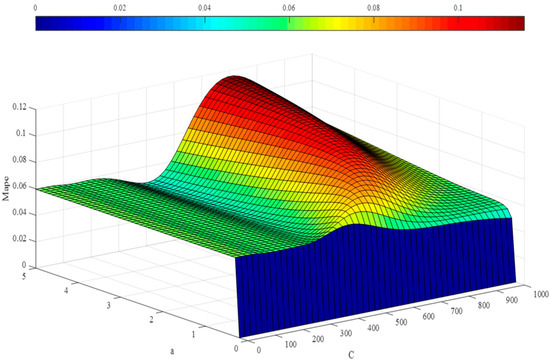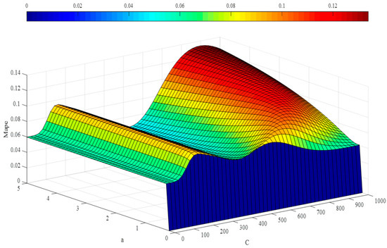 The relationship between C, a, and the MAPE of Marr W-LSSVR for C2H4 in Case 1.
