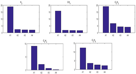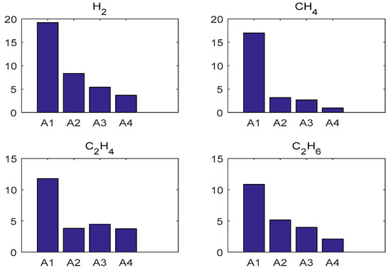 Table 2 illustrates the evaluation performances of BPNN, SVR, PSO-W-LSSVR and ICA-W-LSSVR in MAPE and r2. By analyzing Table 2, it can be seen that the learning ability of ICA-W-LSSVR during the training stage was excellent—its training error was less than 1% and its r2 close to 1. When comparing the data of the testing stage, it shows that the MAPE of ICA-W-LSSVR is less than 4%, which is much smaller than that of BPNN, SVR and PSO-W-LSSVR. The MAPE results for the four forecasting approaches for gases in the two Cases are shown in Figure 11 and Figure 12. As shown in Figure 11 and Figure 12, the W-LSSVR has a significantly better performance than the other three approaches. It can be inferred that W-LSSVR based on ICA has better prediction accuracy and generalization performance than the other methods.