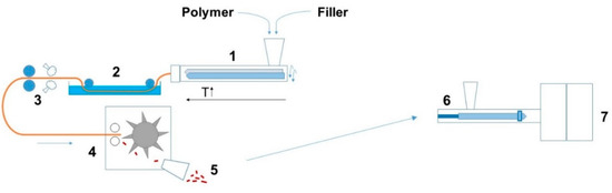 The overall manufacturing procedure is highlighted in Figure 1. For each polymer matrix, compounds with 0, 10 and 20 m% of the flake graphite filler were produced. Additionally, PLA and PA6 filaments with 0.2, 0.5 and 1.0 m% nucleating agent (N.A.) were produced without fillers. Prior to this, the PLA was dried overnight at 60 °C, while PA6, ABS and PS were dried at 80 °C. The carbon fillers were compounded with thermoplastics using a co-rotating twin screw extruder (APV MP19TC-40 Baker, Peterborough, UK) with variable temperature profiles for different matrices (e.g., for PA6 from 220 °C at the inlet to 250 °C at the die). The extruded filaments were directly cooled in a water bath at room temperature and chopped in pellets. Prior to injection molding, the pellets were dried overnight. The composites were molded into tensile bars according to ISO 527-2 specimen type A, using an injection molding machine (Engel e-victory, Schwertberg, Austria). The dosing speed was maintained as low as possible to avoid damage to the graphite filler.