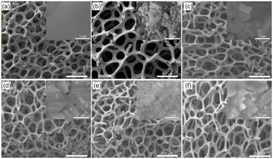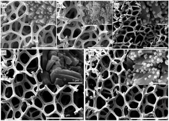 The immersion time and the concentration of FeCl3 and HCl played a vital role during the preparation process. The surface morphology of the Cu foams after immersion and ultrosonication in the acid aqueous solution of FeCl3 for different times was characterized by SEM in Figure 3. It could be seen that the immersion time of 10 min was enough to create many nano-size particles onto the surfaces with the help of the chemical reaction and ultrasonication. Furthermore, the mass of Cu components decreased with the progressive oxidation-reduction reaction. The Cu amount removed from the original substrate after 10 min immersion was decided by the amount of Fe3+ in solution.