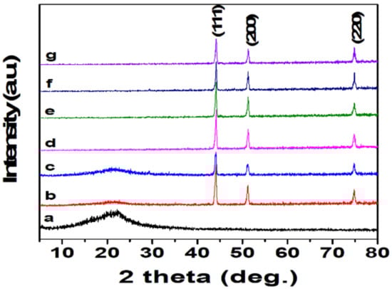 XRD patterns of (a) glass plate and double faced adhesive tape; (b) Cu foam; (c) Cu foam etched by FeCl3; (d–g) etched Cu foams modified by EE, DE, HDE, and ODE, respectively.