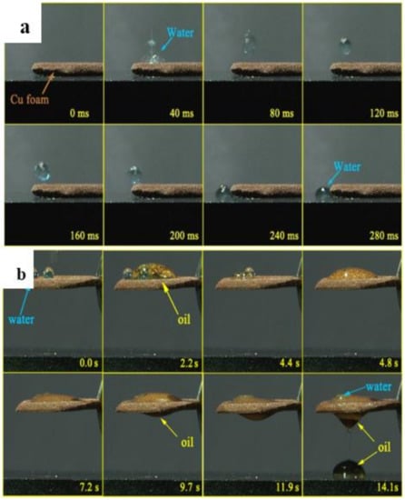 A series of snapshots showing a droplet of water bouncing and oil penetrating on the prepared copper foam. (a) Bouncing process of a water droplet. (b) Penetrating process of an oil droplet. Snapshots of a water droplet impacting a superhydrophobic copper foam surface. The snapshots were obtained using a high-speed camera. The water droplet and gasline engine oil continually falls freely from a height of H = 6 cm and 8 cm, respectively. The volumes of each water droplet and gasline engine oil is 50 µL, respectively.
