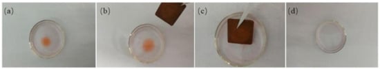 Optical images of copper foam for the cleanup of hexane on the water surface (a–d).