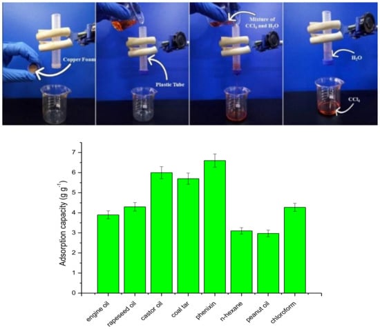 Copper foams (purity ≥ 99.999%, pore size 0.1 mm) were purchased from Suzhou Taili Metallic Foam Factory. n-ethanethiol (EE), n-dodecanethiol (DE), n-hexadecanethiol (HDE), and n-octadecanethiol (ODE) were purchased from Tianjin Kermel Chemical Reagent Co. (Tianjin, China). Ferric chloride, ethanol, acetone, phenixin (CCl4), n-hexane, and chloroform (CHCl3) were obtained from Jiangsu Yonghua Fine Chemistry Co. (Changshu, China). Oil red (Sudan III), methylene blue, allura red, NaOH, HCl, NaCl, ethanol, and methanol were obtained from Tianjin Fine Chemical Co. (Tianjin, China). Gasoline engine oil, rapeseed oil, castor oil, coal tar, and peanut oil were purchased from a local market. Polystyrene (PS, average Mw~192,000), chlorobenzene (CB), and dimethyl sulfoxide (DMSO) were purchased from Sinopharm Chemical Reagent Co., Ltd. (Shanghai, China). The current adopted solvents, such as chlorobenzene, chloroform and DMSO, are typical pollutants, which could cause environmental impacts for large scale application. These solvents could be recycled with green technology, such as membranes [,].