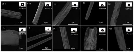 SEM micrographs of the surfaces (a–j) and the WCAs of the as-spun PS fibers fabricated from solutions with varying compositions.