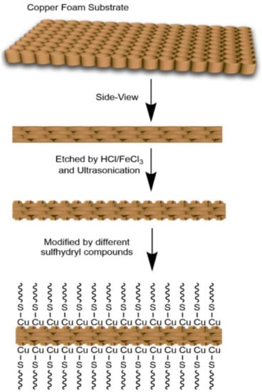 The superhydrophobic Cu foams were prepared through a similar method as already reported []. The procedure of fabricating the superhydrophobic surface onto Cu foam is briefly illustrated in Scheme 1, which includes the chemical etching in FeCl3/HCl mixed solutions to create rough structures and subsequent modification with four sulfhydryl compounds to reduce the surface energies. Briefly, a piece of Cu foam (10 × 10 × 1.5 mm, 30 × 30 × 1.5 mm) was firstly ultrasonic rinsed with acetone, ethanol, and deionized water for several times sequentially, and then desiccated with N2. FeCl3 was dissolved in 0.1 M HCl in order to keep the acidic condition during the reaction. Then, a piece of the cleaned Cu foam was immersed in FeCl3 solution in the concentration range of 2.5–40 mg/mL for 5–25 min with consequent ultrasonication, followed by water washing, and drying. After the growth of nanostructures, the substrates were covered with a rough layer and modified with each thiol solution for 5–25 min, respectively. The concentration for four thiol compounds was selected in the range of 1–20 mmol L−1 in ethanol. At last, these Cu foams were rinsed with abundant ethanol and desiccated with N2.