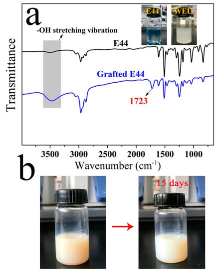 The FTIR spectrum of pure E44, grafted E44. Inset digital photograph of E44 respectively dispersed in water and WEU (a), and the stability of WEU after being stored for 15 days (b).