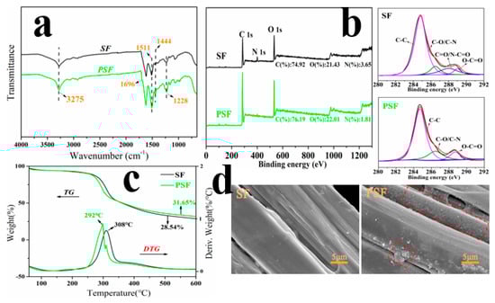 The thermal properties of the SF and PSF were examined by TGA, as shown in Figure 2c. The temperature at the maximal degradation rate in the DTG curve of PSF decreased to 292 °C as compared to that of SF, which was 308 °C. In addition, the residual weight of PSF slightly increased from 28.54% to 31.65% [].