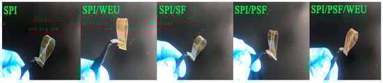 The SPI-based film was prepared via a two-step casting method []. First, the SPI (5 g), glycerol (2.5 g), and distilled water (95 g) were sequentially added to a 250 mL beaker and stirred for 30 min. The beaker content was adjusted with an NaOH solution (10% (w/w)) to pH 9.0 ± 0.1, and then heated in a water bath at 85 °C for an additional 30 min. Certain amounts of SF or PSF and WEU (as listed in Table 2) were dispersed in the SPI solution while the mixture was constantly stirred. Then, the aforementioned suspension was poured into a Teflon tray with 150 mm in diameter after bubbles had been removed by an ultrasound treatment, and then vacuum dried at 60 °C to obtain SPI-based round film with a diameter of 150 mm. Films were stripped after drying for 24 h and placed in a saturated K2CO3-regulated (50% ± 2% relative humidity) desiccator for further use.
