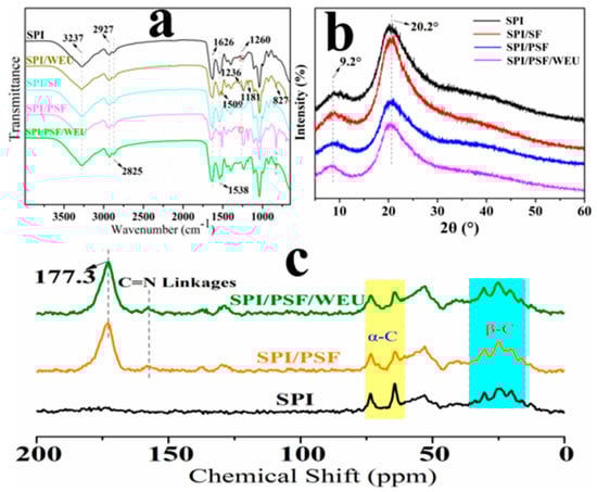FTIR spectrum of neat SPI, SPI/WEU, SPI/SF, SPI/PSF and SPI/PSF/WEU films (a), XRD curves of neat SPI, SPI/SF, SPI/PSF, and SPI/PSF/WEU films (b), and solid-state 13C NMR analysis of neat SPI, SPI/PSF, and SPI/PSF/WEU films (c).