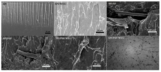SEM images of neat SPI, SPI/WEU, SPI/SF, SPI/PSF, and SPI/PSF/WEU films’ cross-sectional morphologies and the surface image of the SPI/PSF/WEU film.