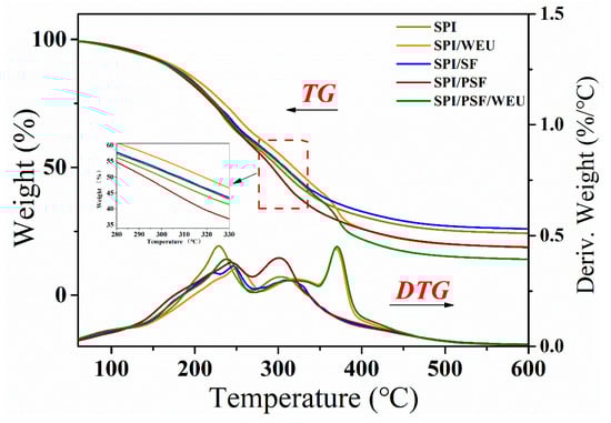 Thermogravimetric (TG) and derivative thermogravimetric (DTG) curves of neat SPI, SPI/WEU, SPI/SF, SPI/PSF, and SPI/PSF/WEU films.