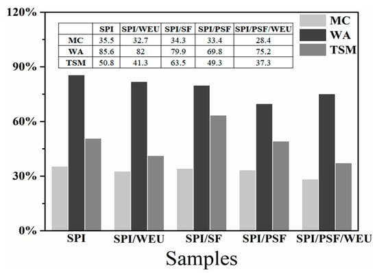 The water resistance of different SPI-based films was determined by measuring their moisture content (MC), water absorption (WA), total soluble matter (TSM), and surface hydrophilicity (WCA). As shown in Figure 8, compared with pristine SPI film, the WA and TSM of SPI/WEU film decreased from 85.6% to 81.96%, and from 50.8% to 41.26%, respectively. This is because the WEU was physically/chemically combined with the soy side chain, as confirmed by the ATR-FTIR and 13C NMR results. After the introduction of SF, the TSM of the SPI/SF film increased from 50.8% to 63.47% as compared to the pristine SPI film, indicating a poor combination between the SF and soy protein matrix. After modification by dopamine, the PSF exhibited a better surface reactivity to induce multiple chemical bonds between the PDA layer and soy hydrophilic groups via Schiff base reactions and Michael additions. Compared to the pristine SPI film, the WA and TSM of the SPI/PSF/WEU film decreased to 75.21% and 37.28%, respectively, exhibiting significant decreases of 12.1% and 26.6%. Additionally, the WCA were measured to investigate the surface hydrophobicity of different SPI-based films, as shown in Figure 9. With the introduction of WEU, the WCA of the SPI/WEU film increased to 71.8° compared with the WCA of the pristine SPI film, which was 58.6°. In contrast, the WCA of the SPI/SF film decreased to 51.1° after introducing SF. The WCA of the SPI/PSF film increased to 75.8°, indicating good water resistance. After the synergistic modification of WEU and PSF, the WCA of the SPI/PSF/WEU film attained 76.5°. These results indicate that the water resistance of the SPI-based film improved significantly after the introduction of WEU and PSF, which might be due to the improvement of the SPI-based film crosslinking networks, as confirmed by FTIR, NMR, and XRD.