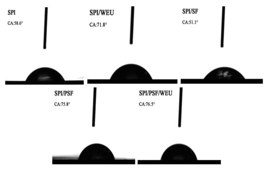 The water contact angle (WCA) of neat SPI, SPI/WEU, SPI/SF, SPI/PSF, and SPI/PSF/WEU films.
