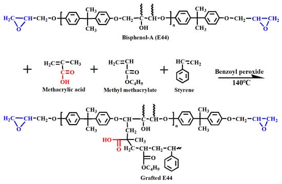 Acid value was measured to investigate chemical grafting of E44. The theoretical acid value was calculated based on the amount of acrylic monomer []. The experimental acid value was measured as follows. E44 or WEU was weighed into a conical flask, and 50 mL of a mixed solvent (toluene/ethanol: 2/1), was added to completely dissolve the sample. The phenolphthalein indicator was added to the sample solution, immediately titrated with potassium hydroxide solution until red color appeared, and recorded the volume of potassium hydroxide solution consumed []. The experimental acid value (A, mg (KOH)/g) was determined as follows: