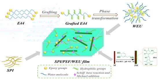Epoxy resins, as low-cost industrial adhesives, are widely used in the adhesive and coating industries due to their high reactivity and the excellent mechanical properties of the cured product [,]. However, epoxy resins are non-polar polymers [], and have poor compatibility with the polar side chain of the soy protein molecule, which makes them unsuitable candidates for SPI-based film modification. Transforming non-polar polymers into waterborne and water-soluble matrixes was a popular approach in the fields of adhesive, coating, and composite production [,]. Waterborne matrices are characterized by a high level of compatibility with hydrophilic matrices, a relatively low cost, and good reactivity []. This provides a new pathway for transforming non-polar epoxy resin into a waterborne epoxy emulsions (WEU) matrix characterized by good compatibility with the polar side chain of the soy protein molecule, and makes it possible for low-cost waterborne epoxy resin to be used in the crosslinking modification of SPI-based film [,]. However, increasing the strength of SPI-based film without compromising its toughness remains a significant challenge.