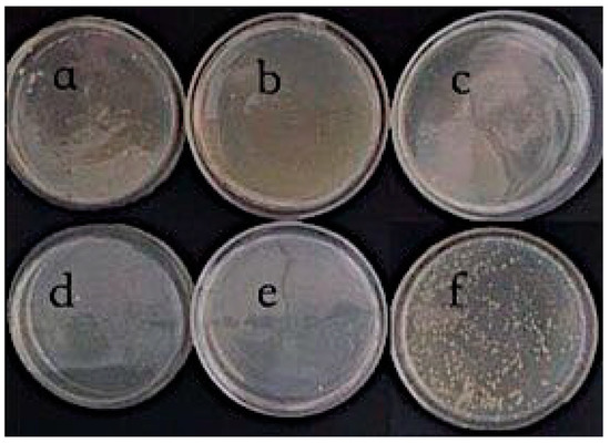 Photographs of antibacterial activity of CS/Gr modified bamboo fiber fabrics (CGBFs). (a) C1G1; (b) C1G2; (c) C1G3; (d) C1G4; (e) C1G5; and (f) control sample.