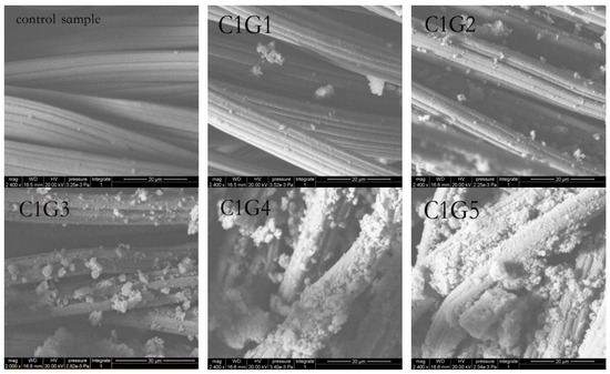 Figure 7 shows ESEM images of CS/Gr modified bamboo fiber fabrics (CGBFs). With the increase of graphene content, the surface adhesion of bamboo fiber fabrics increased significantly. The surface of untreated fabrics was smooth, free of impurities, and with characteristic tubular texture by ESEM. By comparison, it can be found that when the graphene content reaches 0.4 wt%, the surface morphology of treated bamboo fiber fabric is covered by graphene finishing agent, which masks the original characteristic stripes on the surface of the fiber. When the graphene content is 0.3 wt% or lower, graphene is loaded on a single fiber and will not attach between the fibers, so adding a small amount of graphene will not block the fabric, will maintain the air permeability, and improve the comfort of wearing [12]. At the same time, a lot of irregular accumulation can be found on the surface of bamboo fibers covered by finishing agents, which characterizes the graphene microsheets dispersed on the fabric. With the increase of graphene concentration, the dispersion of CS/Gr in some parts of bamboo fibers is macroscopically uneven.