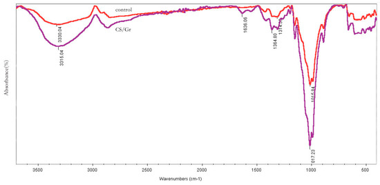 Figure 8 shows the infrared spectra of CS/Gr modified fabrics. It can be seen that the broad absorption peaks of 3500 cm−1–3300 cm−1 are due to the stretching of the -OH group. The characteristic absorption peaks of hydroxyl groups indicate that all samples contain cellulose. The CS/Gr spectra shows that 1364 cm−1 and 1017 cm−1 after adding graphene, correspond to C–O and C–O–C stretching correspond to graphene, respectively. The peaks at 3330 cm−1 and 1017 cm−1 are obvious, which are caused by the overlap of O–H and C–O stretching peaks of graphene with the stretching peaks of fabric cellulose. The absorption band near 1636 cm−1 is the in-plane stretching vibration peak of amide-NH, which indicates that the amino group in chitosan covalently binds to the carboxy group of graphene, and proves that the crosslinking of chitosan and graphene has been completed. Compared with CS/Gr composite fabrics, the stretching vibration absorption peak of -OH at 3330 cm−1 of crosslinked fabrics shifted to a low wavenumber (red shift) and its width narrowed, indicating that crosslinking enhanced the interaction between modifiers and fabrics [13].
