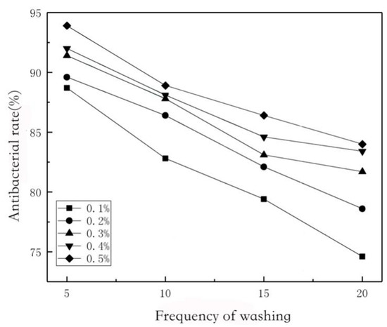 Washability is an important index for evaluating fabric properties. The antibacterial rate of fabrics impregnated with 0.1% chitosan solution decreased by 32% after five washes. The reason is that acetic acid is easy to wash and remove. The fabrics with different graphene content were washed 20 times, and the antimicrobial rate was measured every 5 times and the results were recorded (Figure 9). The sterilization efficiency of these five fabrics decreased slowly with the washing times. There is a hydrogen bond between chitosan and cellulose. Graphene and cellulose fibers have poor crosslinking stability. After crosslinking of chitosan, graphene and chitosan form an enclosed structure [16]. At the same time, it was found that when graphene content was 0.3, 0.4 and 0.5 wt%, the degree of decline began to be gentle after 10 times of washing. Perhaps with the increase of graphene content, the amount of self-polymerization of cellulose long molecular chains decreased relatively, and the contact area between graphene and cellulose fibers would not be markedly reduced, thus the washing durability rate would be increased [17].