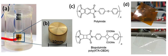 Photographs for (a) the laboratory-made cell and (b) the electrode for resistivity measurement for polyimide and biopolyimide films with sizes smaller than 40 mm square. (c) Chemical structures and (d) photographs of polyimide (top) and biopolyimide (bottom) films.