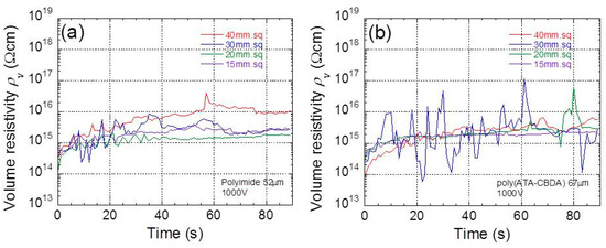 Figure 2a,b exhibit the time profiles of electric resistivity at 1000 V for polyimide and biopolyimide films with various film sizes, respectively. As seen in the graphs, the electric resistivity showed large noises since the measured current was in the order of 1 pA. The electric resistivity for all films increased over time during the 40 s after the electric voltage was applied. The increase in the resistivity was due to the mobile ions in the film, which is called the charge current, resulting in a macroscopic polarization. At 90 s, only leak current due to the mobile ions occurred in the films, which gives the equilibrium resistivity. No significant decrease in resistivity was observed for films with small sizes. According to our results, the resistivity for synthetic polyimide ranged from 1015–1017 Ωcm. These values were higher than the values in the literature, which was 1013 Ωcm [18], 1015~1016 Ωcm [19], 1010~1012 Ωcm [20], or 1011 Ωcm [21]. It is natural for the composites of polyimide that, with fillers, the resistivity is largely reduced by conductive ions in the fillers [17,19,21,22]. However, low resistivity is also observed for neat polyimide. It can be considered that there are a few factors involved in the large variation in volume resistivity, e.g., measurement method and drying condition of samples. However, these experimental conditions are not clearly specified in the literature, although it is quite important. We intentionally selected the time profiles of resistivity with comparatively high noise in this paper. The results above show that the resistivity for these films can be measured for small samples, even when the resistivity contains large noises. On the other hand, there is a report showing high resistivity with 5 × 1019 Ω cm, with a thickness of 50 μm [17], measured in a vacuum with 10−6 Torr. The main reason for the variation of resistivity is probably due to the humidity and the water content in the polyimides.