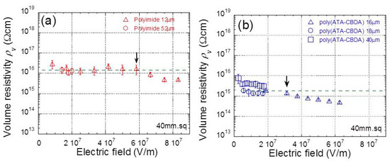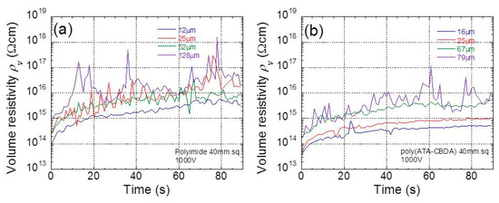 Figure 4a,b demonstrate the time profiles of electric resistivity at 1000 V for polyimide and biopolyimide films with various thicknesses, respectively. The sample is a square 40 mm in size. The electric resistivity for all films increased over time during the 40 s after the electric voltage was applied. Similar phenomenon, i.e., charge current and leak current, were also observed in this experiment. It was clearly observed, for both films, that the electric resistivity depends on the film thickness. This strongly indicates that electric resistivity is a function of the electric field strength.
