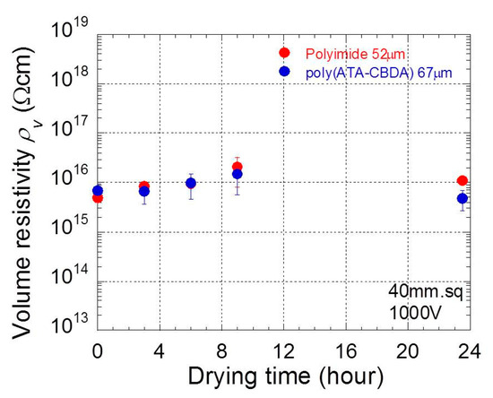 Figure 8 displays the relation between the averaged resistivity at 1000 V and the drying time for polyimide and biopolyimide films. The electric resistivity was averaged over three data sets measured by the same film. The humidity in the experimental room was 34% RH when the experiment was performed. Both polyimide and biopolyimide films demonstrated low electric resistivity (~1015 Ωcm) at short drying times, below three hours, and the resistivity increased to 1016 Ωcm at longer drying times. This strongly indicates that polyimide and biopolyimide films stored in humidity of 30%–50% absorbed water, and the absorbed water lowers the electric resistivity. In fact, the electric resistivity for polyimide films without drying was significantly reduced to ~1013 Ωcm when the humidity was 60% RH.
