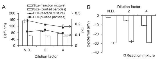 Changes in the (A) particle effective diameter (columns) and PDI (lines) and (B) ζ-potential potential following dilution of reaction mixture and purification of GNPs.