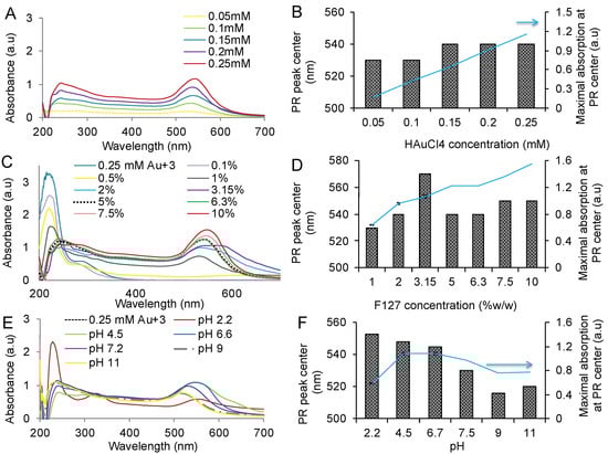 (A,C,E) Absorbance spectra, and (B,D,F) the position of the PR peak maxima (columns) and the maximal PR absorbance intensity (▴) in the mixtures containing HAuCl4 and F127 after 2 h incubation at 45 °C. (A,B) HAuCl4 concentration is constant (0.25 mM) and F127 concentration varied from 0.1 to 10 % w/w. The pH of the F127 solution before HAuCl4 addition was pH 6.5. In all cases reaction is complete based on the absence of a peak at 220 nm or shift of the pick to 240 nm for 0.25 mM. (C,D) F127 concentration is constant (6.3% w/w), HAuCl4 concentration is varied from 0.05 to 0.25 mM. The pH of the F127 solution before HAuCl4 addition was pH 6.5. (E,F) 0.25 mM HAuCl4 and 6.3% w/w F127 mixture was adjusted to various pH.