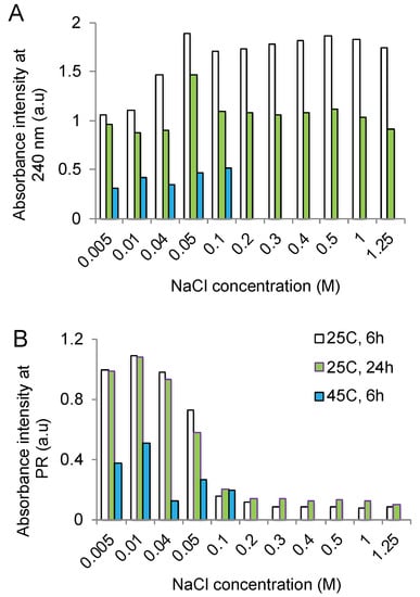 (A) Absorbance intensity at 240 nm and (B) the maximal absorbance intensity of the PR peak in the mixtures of 0.25 mM HAuCl4 and 6.3% w/w F127 as a function of the NaCl concentration after incubation of the reaction mixture at 25 °C or 45 °C at 6 h and 24 h.